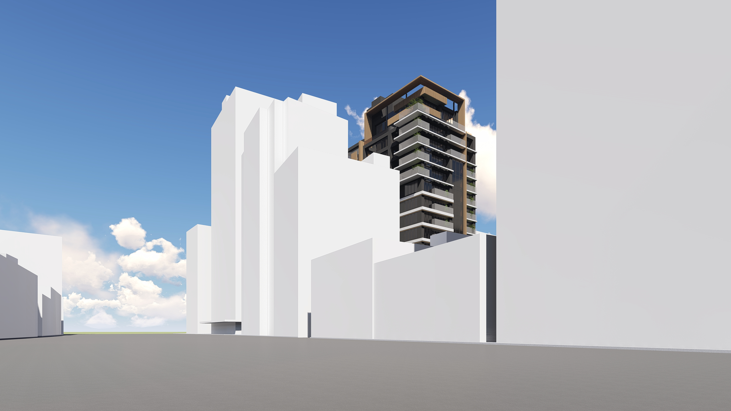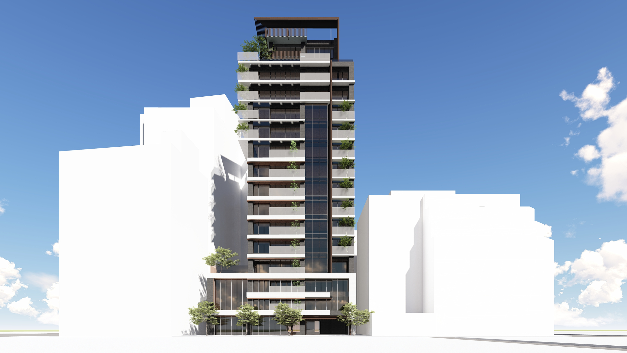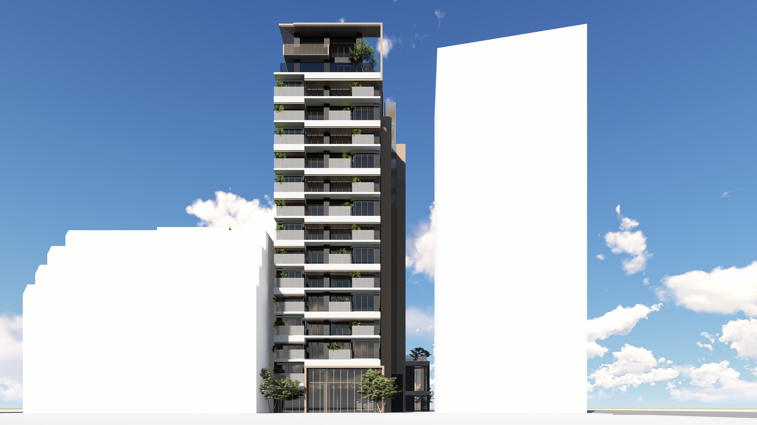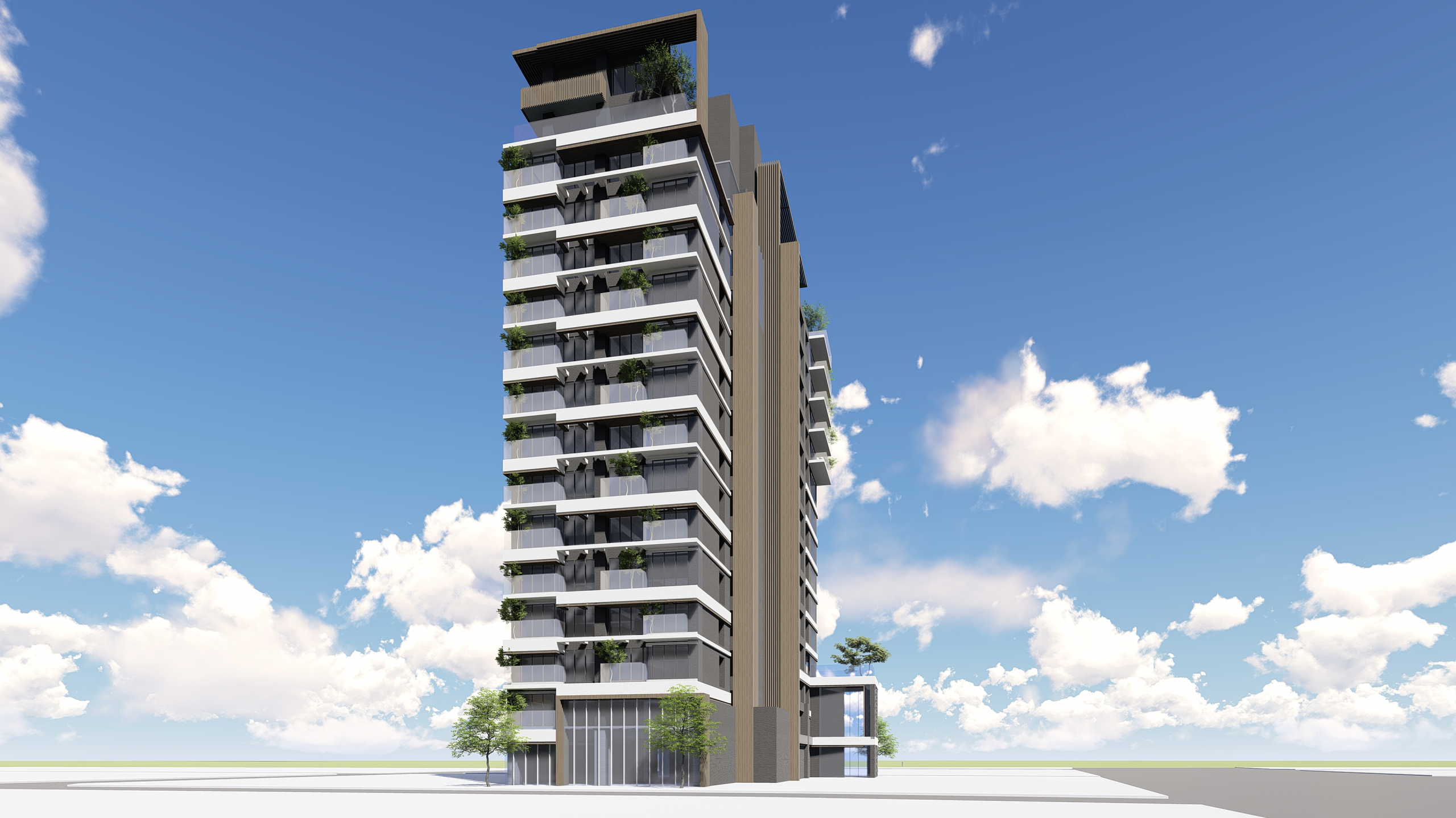 基地位於台北市中心,是一個新舊建築交織錯落的位置,我們希望以「垂直光景」為主題, 透過玻璃立面引入天光,橫向層板如樂章般錯落,形成光與影的韻律。 並嘗試以垂直院落延續城市綠意,使建築成為都會中一座人文與自然共構的現代生活。