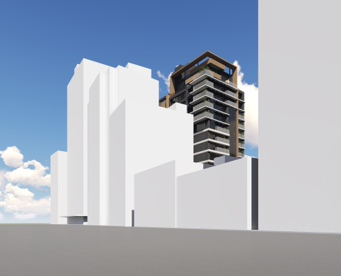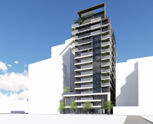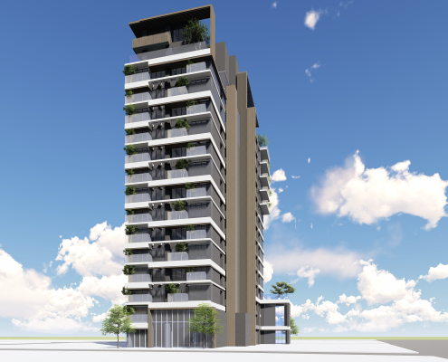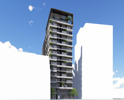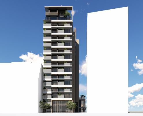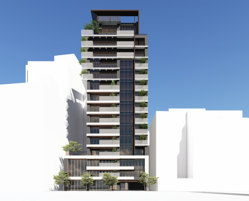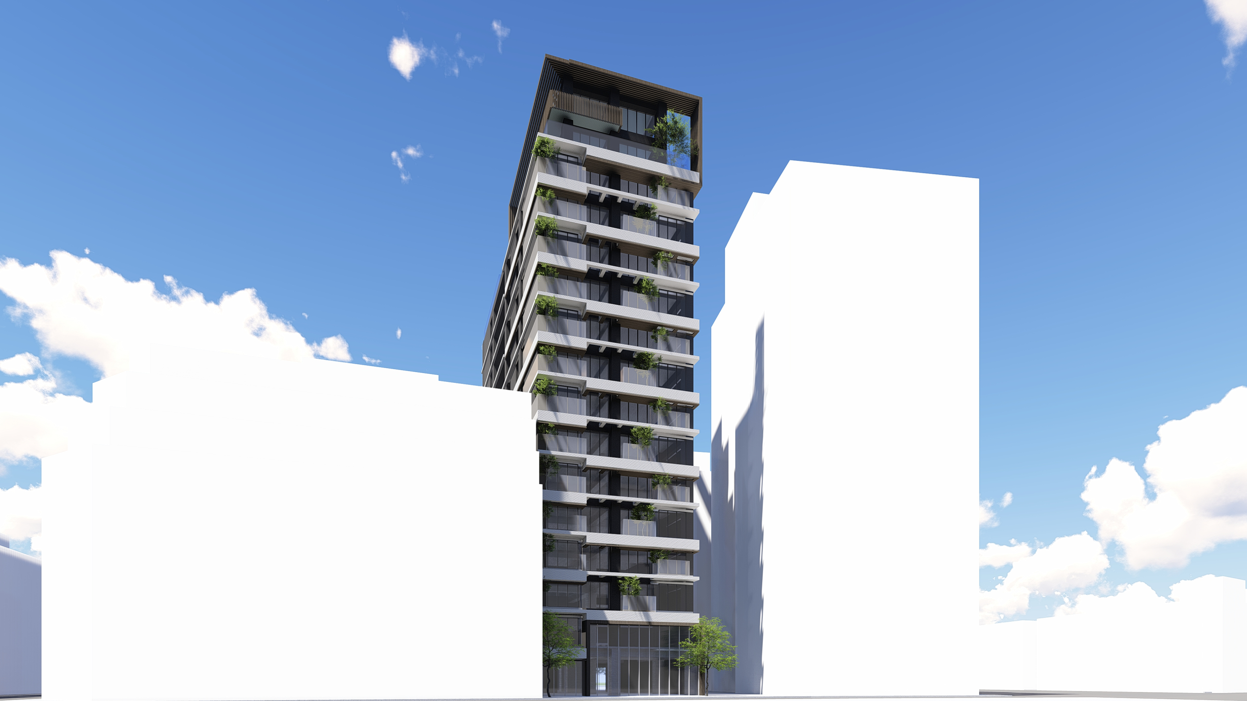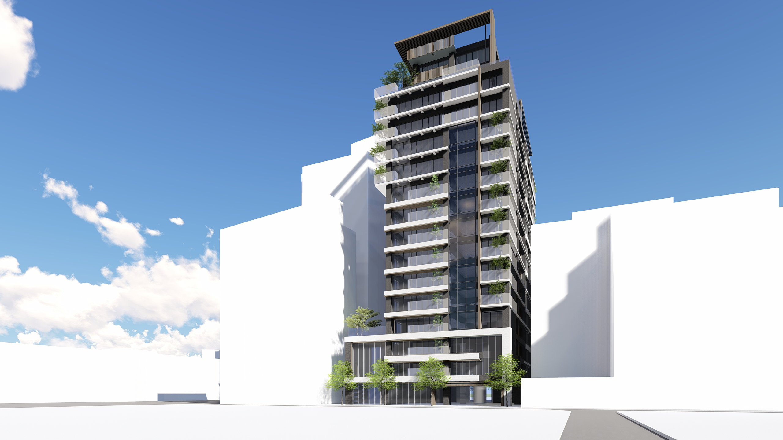 基地位於台北市中心,是一個新舊建築交織錯落的位置,我們希望以「垂直光景」為主題, 透過玻璃立面引入天光,橫向層板如樂章般錯落,形成光與影的韻律。 並嘗試以垂直院落延續城市綠意,使建築成為都會中一座人文與自然共構的現代生活。